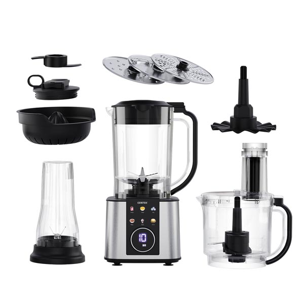 Тип: кухонный комбайн 9 в 1Тип блендера: настольныйМощность: 2000 ВтКоличество скоростей: 10Объем блендера: 1.75 лОбъем шейкера: 0.6 лОбъем измельчителя: 2 лАвтоматических программ: 6Плавная регулировка скоростиЦветной сенсорный экранLED-дисплейСоковыжималка для цитрусовыхИзмельчительКрупная теркаМелкая теркаЭмульгаторШинковкаТестомесБлендерШейкерМатериал: пластик, сталь