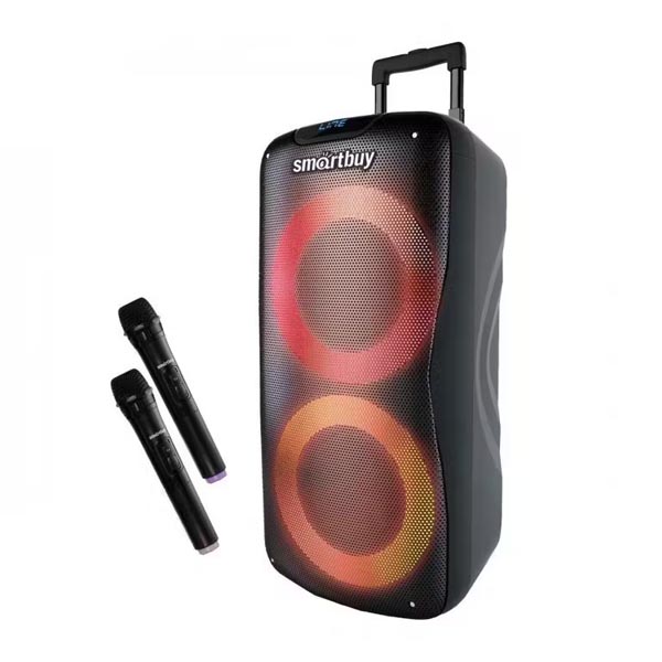 Тип Портативная колонкаТип акустической системы 1 колонкаСуммарная мощность системы 100 ВтЧастотный диапазон 50-20000 ГцКоличество полос 2Количество динамиков 2ФункцииЭквалайзерПредустановки эквалайзера 6FM-радиоИнтерфейсы и коммуникацииАудиовход 3.5 мм 2 шт.Разъем USBBluetoothВерсия Bluetooth 5.0Поддержка карт памяти microSD (TF/TransFlash)ИндикацияДисплейУправлениеТип управления ЭлектронныйРегулировка громкостиУправление воспроизведениемУправление с помощью пульта ДУПитаниеТип питания Собственный аккумулятор, СетьЕмкость аккумулятора 7000 мА*чНапряжение аккумулятора 12 ВМаксимальное время работы 12 чКорпусМатериал Металл, ПластикКомплектацияПульт ДУГабариты и весВысота 675 ммШирина 340 ммГлубина 345 ммВес 11000 гВыдвижная ручка и ролики для удобного перемещения. RGB подсветка. 2 беспроводных микрофона в комплекте.