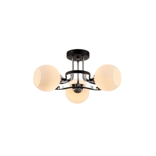 Высота: 22 см.Диаметр: 43 см.Тип цоколя: E27Площадь освещения: 6-9 кв.м.Допустимая мощность лампы: 40 WКоличество ламп: 3 шт.Материал каркаса: МеталлМатериал плафона: СтеклоЦвет каркаса: Черный + ХромовыйЦвет стекла: Белый