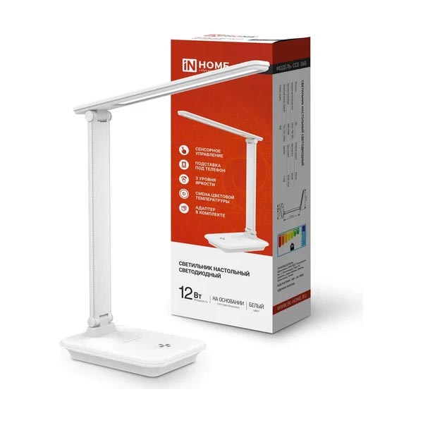 Мощность светильника: 12 ВтМощность лампы: 12 ВтТип лампы: встроенные светодиодыКоличество ламп: 1 штНапряжение питания: 220 ВЦоколь: встроенные светодиодыТип подключения: шнур с вилкойЗащита от пыли и влаги: IP20Стиль: современныйЦветность: регулируемый (3000–6500 K)Наличие диммераСенсорное управлениеМатериал корпуса: пластикМатериал плафона: пластикПоверхность плафона/арматуры: глянцевая/глянцеваяЦвет корпуса: белыйЦвет плафона: белыйМаксимальная высота: 560 ммГабариты без упаковки: 170 × 120 × 560 ммВес нетто: 0,69 кг