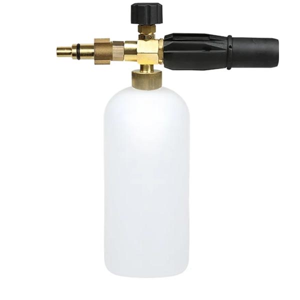 Тип изделия: пенная насадка (пеногенератор для мойки высокого давления)Материалы:корпус: латунь бачок: химически стойкий пластик с мерной шкалой (шаг 100 мл)объем бачка: 1 л (достаточно для мойки 1–2 легковых автомобилей)форсунка: Ø 1,25 мммаксимальная температура воды: до 60 °CКонструкция и особенности:регулировка подачи моющего средстварегулировка направления распыленияпенная таблетка: установленасовместимость: проверена на герметичность соединенияГабариты:размер (Д×Ш×В): 220×85×300 мм