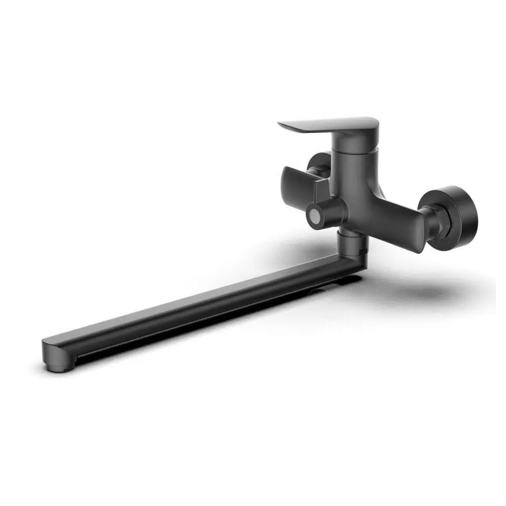 Современный матовый черный смеситель с поворотным длинным изливом и душевой лейкой — идеален для стильных интерьеров.Корпус из цинкового сплава, керамический картридж 35 мм, монтаж на 2 отверстия — надежность и долговечность.Универсален: подходит для квартиры, загородного дома
