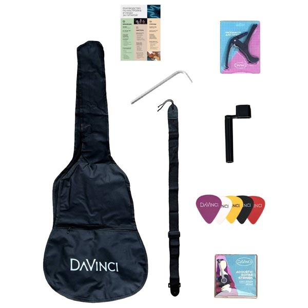 Чехол для акустической гитары размера 7/8Комплект маталлических струн для гитары5 медиаторовКаподастрВертушка для струнРемень для гитары