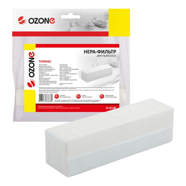 HEPA фильтр Ozone microne H-01W высокоэффективной очистки предназначен для завершающей очистки воздуха в помещении, которое требует высокое качество воздуха, например, медицинских помещений. Фильтр состоит из мелкопористых материалов, что служит эффективному задерживанию частиц размером до 0,3 мкм. Фильтры HEPA последнего поколения имеют степень очистки воздуха около 95-97%. Фильтры подлежат к промывке, а значит, они не являются одноразовыми.