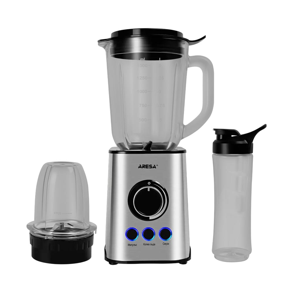 Номинальная потребляемая мощность: 300 ВтМаксимальная мощность: 1000 ВтПлавная регулировка скоростиИмпульсный режимРежим колки льдаРежим смузиОбъем чаши: 1,5 лМатериал чаши: стеклоЧаша кофемолки с герметичной крышкойЛезвия из нержавеющей сталиЗащита двигателя от перегреваСветовые индикаторы режимовНескользящие ножкиОсновные функции: измельчение, смешивание, колка льда, помол кофеКомплектация: чаша 1,5 л, кофемолка 400 мл, бутылка для воды спортивная 600 мл