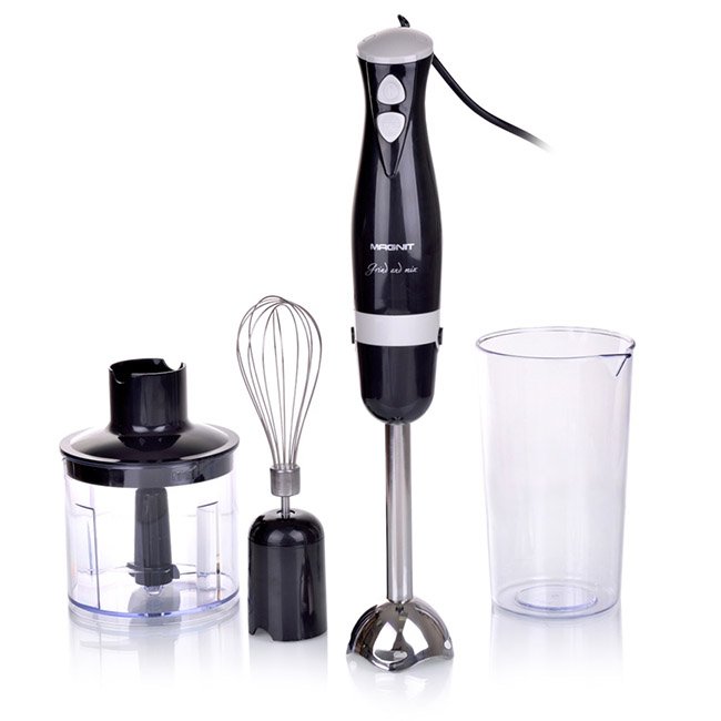 Общие характеристикиМощность: 600 ВтНапряжение: 220-240 ВЧастота: 50-60 ГцКоличество скоростей: 2Материал лезвий: нержавеющая стальМатериал корпуса и погружной части: высокопрочный пластик и нержавеющая стальМерный стакан для смешивания: 0,7 лИзмельчитель (чоппер): 0,5 лВенчик для взбивания яиц и крема3 в 1: подходит для измельчения, взбивания, смешиванияБлендерный наборВ комплекте: блендернасадка-венчикемкость для измельчения-чоппестакан для смешиванияПониженный уровень шума