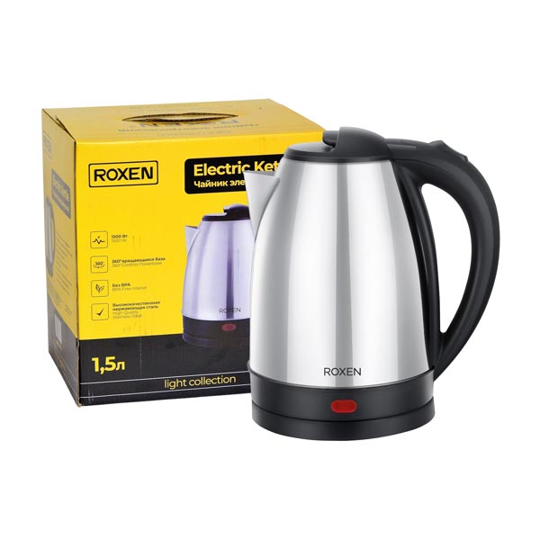 Мощность 1500Вт.Объем 1,5л.Корпус нержавеющая сталь.Автоотключение при закипании.Возможность поворота на подставке на 360*.Закрытый нагревательный элемент из нержавеющей стали.Световой индикатор работы