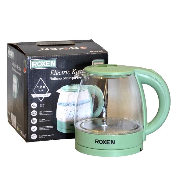 Мощность 1500Вт.Объем 1,2л.Корпус из термостойкого стекла.Автоотключение при закипании.Возможность поворота на подставке на 360*.Закрытый нагревательный элемент из нержавеющей стали.Световой индикатор работы