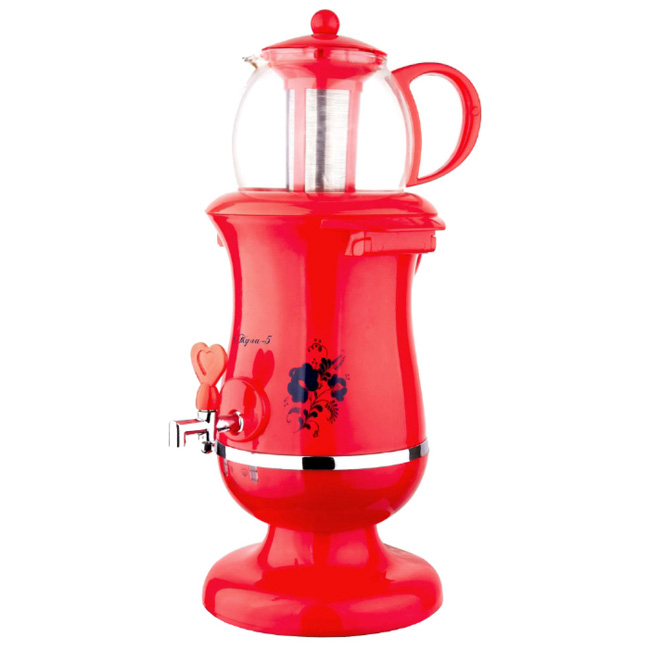 Технические характеристики:Тип - самовар Объем - 2.5 л Мощность - 2200 Вт Тип нагревательного элемента - закрытая спираль Заварочный чайникОбъем заварочного чайника - 1200 мл Материал корпуса - пластик Материал заварочного чайника - стекло Особенности:Безопасность - блокировка включения без воды Индикация включенияРисунок на корпусеОтсек для шнура