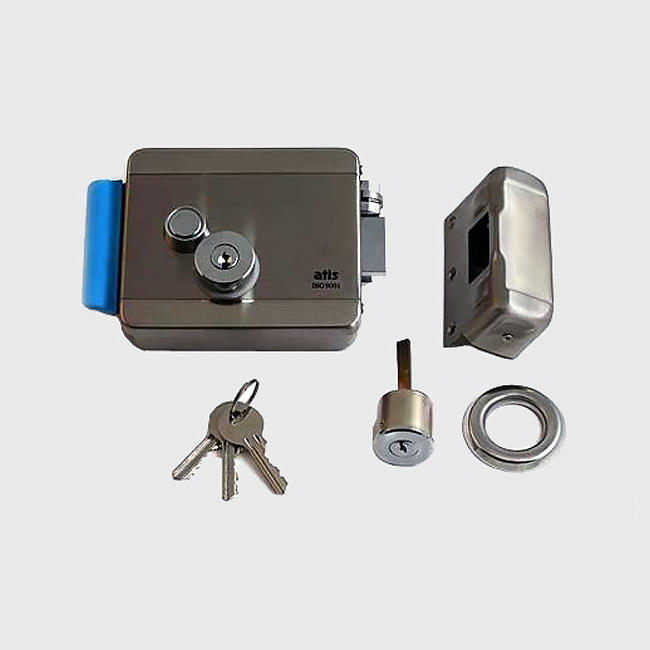 Замки Q-799 имеют стальной корпус, покрытый светлой эмалью. На корпусе замка размещается механическая кнопка для открывания ригеля-защелки изнутри без подачи напряжения на замок. Наружный цилиндр имеет свободную (VAR) конструкцию. Цилиндр связан с замком осью, длина которой может изменяться в больших пределах. Такой цилиндр может быть установлен на дверь толщиной до 85 мм. В комплект поставки входит три ключа.Для открытия этих замков необходимы источники питания, которые рассчитаны на токи не менее 1,5 А.Электромеханический замок имеет накладной тип крепления. Наиболее часто используется совместно с аудио и видеодомофонами, имеющими кнопку открывания электрозамка.