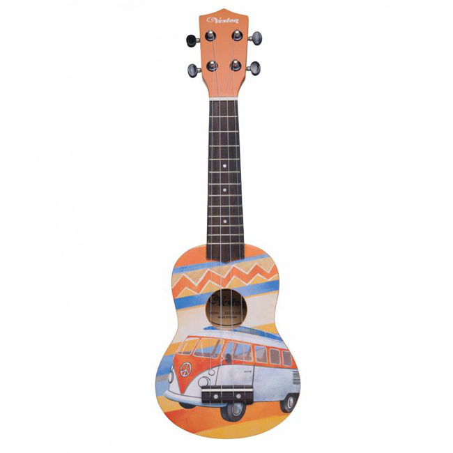 Отличительной чертой этой укулеле является ее дизайн - яркий автобус, ставший символом целой эпохи, так называемй "хиппи-мобиль". Стильный дизайн, наполненный духом свободы, и приятное звучание маленькой гавайской гитары не оставят равнодушными никого.VESTON KUS 25 BUS имеет стандартный размер, который принято называть «сопрано» и который традиционно считается максимально удобным именно для начинающих музыкантов.
