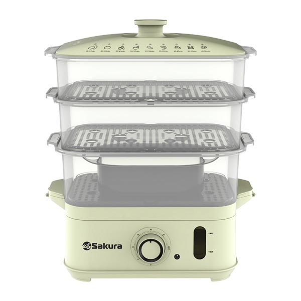 Количество ярусов - 3 Тип управления - механическое Потребляемая мощность - 900 Вт Долив воды во время приготовления Отключение при недостатке воды Таймер Материал корпуса - пластик Материал паровых корзин - прозрачный пластик Общий объем - 14 л Объем резервуара для воды - 2.5 л Объем чаши для риса - 1.2 л Ширина - 23 см Длина - 35 см Высота - 43 см Вес - 2 кг