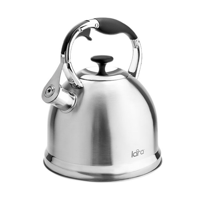 Чайник имеет нейлоновую ненагревающуюся ручку и свисток с кнопочным механизмом.