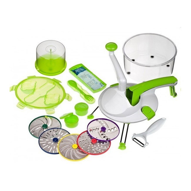 Назначение: для овощей, для фруктов Материал: металл, пластик Габариты: 250x250x150 мм Комплектация:Roto Champ режущая основа;большой контейнер для хранения 2,4 л;крышка для пикников (с функцией сохранения пищи свежей);комбинированный столовый прибор (вилка/ложка крепятся в крышку основного контейнера 2,4 л);охлаждающий термопакет (крепится в крышку для охлаждения приготовленных продуктов) с держателем (крепление в крышку основного контейнера 2,4 л);2 маленьких контейнера для приправ/соусов (каждый с крышкой) – крепится к крышке основного большого контейнера (2,4 л);фиолетовый диск из нержавеющей стали: натирание крупное и соломкой;красный диск из нержавеющей стали: натирание средне - мелкое и соломкой;желтый диск из нержавеющей стали: очень мелкое натирание;темно-зеленый диск из нержавеющей стали: толстые ломтики;контейнер для хранения дисков;овощечистка.Состав: нержавеющая сталь G-nox; АБС-пластик, резина.Вес: 1900 г.Страна производителя: Китай Гарантия: 6 месяцев