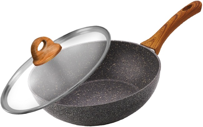 Тип: вок; Размер: Макс. размер (см): 24; Толщина стенок (мм): 3.3; Высота стенок (см): 7; Материал сковороды: кованный алюминий; Материал ручек: бакелит; Антипригарное покрытие: каменное (мрамор, гранит); Функции и возможности: индукционное дно; мытье в посудомойке;