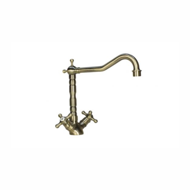 Общие характеристики:Назначение - для кухниДизайн - ретроТип смесителя - двухвентильныйКонструкция излива - поворотный изливЗапорный клапан - керамическийФорма излива - классическая Монтаж:Тип монтажа - настольный (горизонтальный)Монтажных отверстий - 1 штДиаметр отверстий для установки - 35 ммПодвод воды - гибкийМатериал корпуса:Материал корпуса - латуньПокрытие корпуса - бронзаВысота излива (конструкции) - 241 ммВысота струи - 168 ммГлубина конструкции - 231 мм