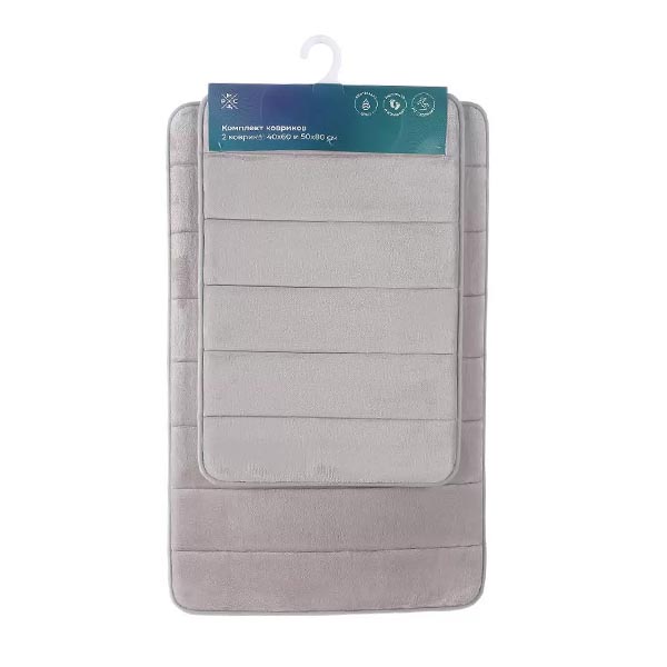 Комплект ковриков для ванной комнаты.Противоскользящий.Материал лицевой стороны: Полиэстр.Материал нижнего основания: поливинилхлорид (ПВХ).Размер комплекта : 40х60 см и 50х80 см