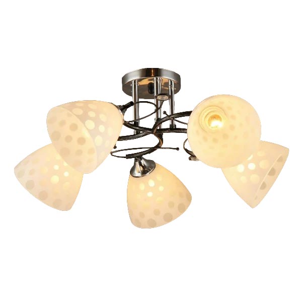 Мощность светильника: 200 ВтМощность лампочки: 40 ВтТип лампы: накаливания/светодиоднаяЦоколь: E27Напряжение питания: 220 ВВысота: 26 смОсновной цвет: белый, хромНаправление плафонов: внизТип крепления: планкаКоличество ламп: 5Диаметр: 60 смЗащита от пыли и влаги: IP20Площадь освещения: 20 м²Цвет арматуры: хромМатериал арматуры: металлПоверхность арматуры: глянцеваяМатериал плафона: стеклоЦвет плафона: белыйПоверхность плафонов: матоваяТип плафонов: молочныйОсобенности: декоративный