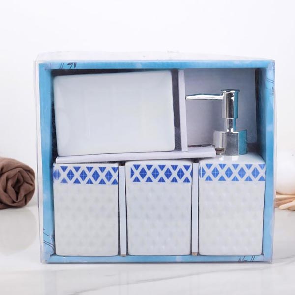 4 предмета: мыльница, дозатор для мыла, 2 стакана, цвет синий — полезное и качественное изделие с современным дизайном.