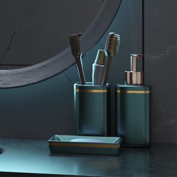 Состав набора - дозатор, стакан, мыльницаМатериал - керамика/пластикЦвет - зеленый, золотой