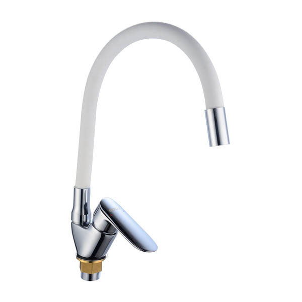 Смеситель для кухни с гибким силиконовым изливом.Картридж - керамический 35мм.Цвет излива - белый.Крепление - гайка.Материал - латунь.В комплекте - подводка из нержавейки 60 см, монтажный ключ.