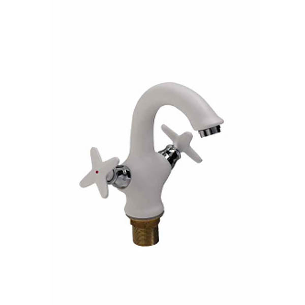 Смеситель для умывальника Кран-букса латунная с керамическими пластинами угол поворота 180 градусов Крепление - гайка Аэратор - пластиковый Покрытие - хром/белый В комплекте - гибкая подводка