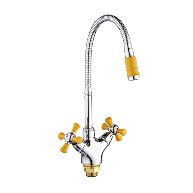 Смеситель для кухни с высоким изливомКран-букса латунная с керамическими пластинами угол поворота 180 градусовПоворотный гибкий изливАэратор: пластиковыйЦвет покрытия корпуса: хром/желтыйКрепление: гайкаМатериал: Металл Цвет: Хром Управление: Вентильное Коллекция: SL92 Вращение излива: Поворотный Стандарт подводки: 1/2"