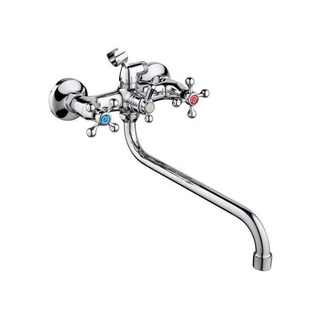 Смеситель для ванны с длинным изливомКран-букса латунная с керамическими пластинами угол поворота 180 градусовШаровое переключение на душПоворотный круглый изливАэратор: пластиковыйПокрытие: хром