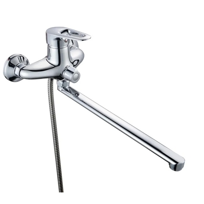Смеситель для ванны с длинным изливомКартридж: керамический 40ммЕвро-переключение на душПоворотный прямой изливАэратор: пластиковыйПокрытие: хромВ комплекте: эксцентрики, отражатели,металлический шланг для душа 1,5м,лейка для душаВ комплекте:шланг, лейка для душа, эксцентрики, отражатели
