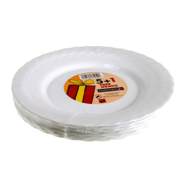 Общие характеристики:Тип - набор обеденных тарелокКоличество персон - 6Состав:Тарелка обеденная - 6 шт.Диаметр - 24.5 смМатериал - ударопрочное стеклоЦвет - белыйМытьё в посудомоечной машине