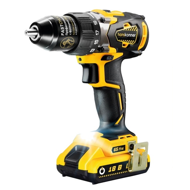Основные характеристики:Устройство: дрель-шуруповертКонструкция: пистолетнаяКоличество оборотов 2000 об/минКрутящий момент 65 Нмс регулировкой / 19 режимов + сверление /Редуктор 2-скоростнойКоличество скоростей 2 / 450/2000 об/мин /Реверс ползунковыйВес 1.54 кгТип патрона: быстрозажимнойДиаметр патрона 13 ммМакс. диаметр сверления дерева 30 ммМакс. диаметр сверления металла 10 ммФункции и возможности:тормоз двигателяэлектронная защита двигателябесщеточный двигательподсветкаКомплектация: фонарькейс (сумка)Источник питания: аккумуляторКомплектный аккумулятор 2 штАккумуляторная платформа Hanskonner 1 Battery SystemНапряжение батареи 18 ВТип батареи Li-IonЕмкость аккумулятора 2.4 АчСовместимые аккумуляторы HBP18-4LВремя зарядки 60 минФункция Power Bank Индикатор уровня заряда Крепление аккумулятора: слайдер