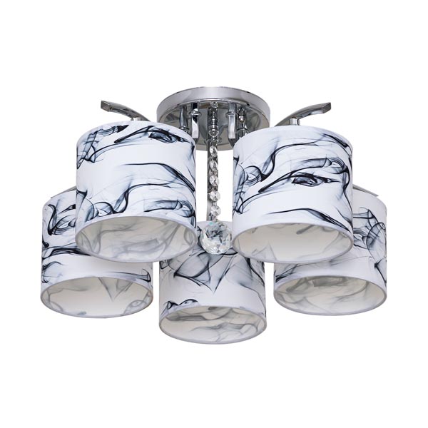 Количество ламп 5 штЦоколь E27Макс. мощность одной лампы 40 WЦвет каркаса ХромЦвет плафона Белый с черным принтомМатериал каркаса МеталлМатериал плафона ТекстильСтепень защиты IP20Особенность ХрустальДлина (ось Z) 52 смШирина (ось X) 52 смВысота (ось Y) 23 см