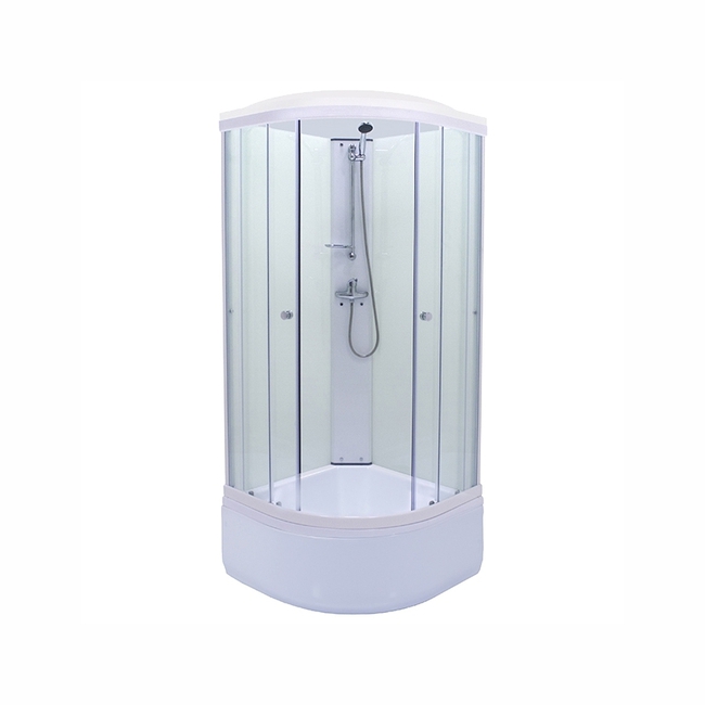 Общие характеристики:Тип - закрытая кабина Ограждение - полностенное Форма - четверть круга Поддон в комплекте Тип поддона - среднийВарианты исполнения передних стенок - прозрачные, полупрозрачные Конструкция дверей - раздвижные Количество створок двери - 2 Особенности:Комплектация - душевая лейка Смеситель - классический Габариты (ШхВхД) - 90x220x90 см