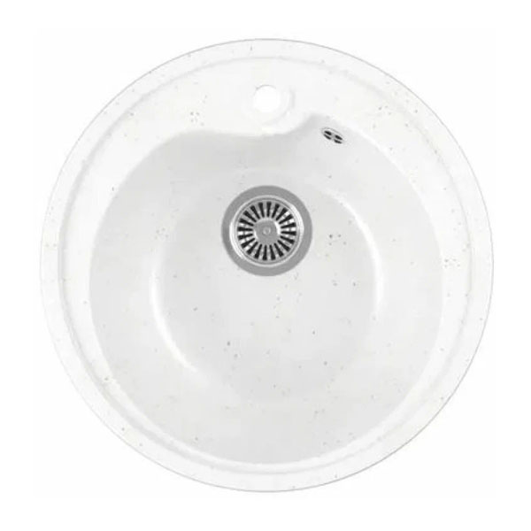 Цвет товара - белыйПокрытие - матовоеКоличество основных чаш - 1Форма мойки - круглаяФорма чаши - круглаяМатериал - искусственный мраморНаличие крыла - неприменимоОсобенности - отверстие под смеситель, угловая, переливРазмеры мойки - 44х44 см