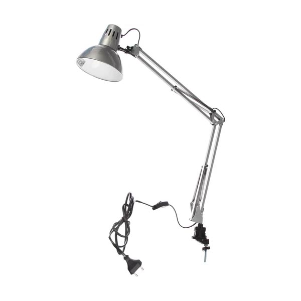 Вид крепления: на струбцинеМощность светильника: 60 ВтМощность лампы: 60 ВтТип лампы: накаливанияКоличество ламп: 1 шт.Тип подключения: шнур с вилкойНапряжение питания: 220 ВЦоколь: E27Материал корпуса: металлМатериал плафона: пластикПоверхность плафона / арматуры: глянцевая / глянцеваяЦвет корпуса: сереброЦвет плафона: сереброМаксимальная высота: 800 ммГабариты без упаковки: 90 × 200 × 415 мм