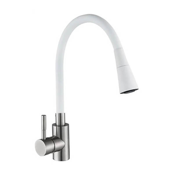 Цвет товара - белый / хромУправление - рычажноеМонтаж - горизонтальныйНазначение - для кухни (мойки)Материал корпуса - нержавеющая сталь, силиконТип излива - поворотный, гибкийВид излива - традиционныйТип подводки - гибкаяЗапорный клапан - керамический картриджОсобенности - аэратор
