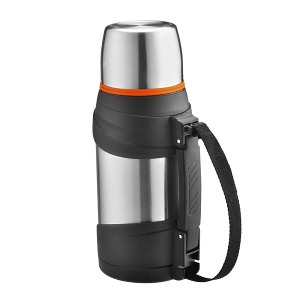 Объем — 1,3 л Материал — нержавеющая сталь, пищевой нейлон, пластмасса, силикон Двойные стенки Пробка-клапан Крышка-кружка Особенности — прорезиненная ручка, ремешок для переноски, ситечко для заваривания чая