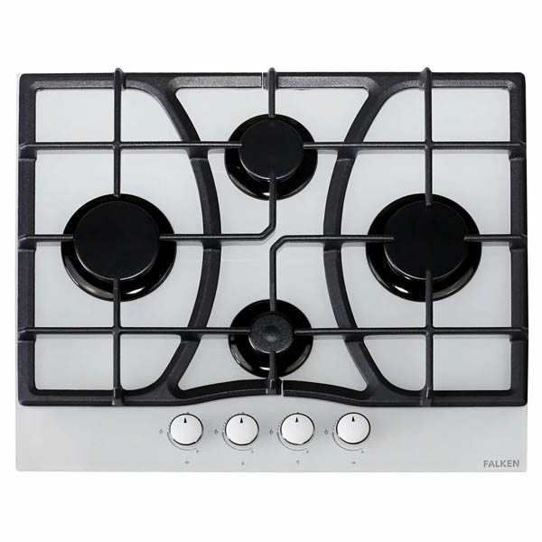 Газовая варочная поверхность Чугунные решетки 4 газовые конфорки: – левая конфорка 3.0 кВт, – нижняя конфорка 1,0 кВт, – правая конфорка 3.0 кВт, – верхняя конфорка 2.0 кВт, Тип подключения: независимый, Размеры варочной поверхности (В х Ш х Г), мм: 45 х 610 х 510, Размер ниши для встраивания (Ш х Г), мм: 560 х 480-490 , Цвет: белое закаленное стекло 8 мм,цвет ручек - «белый с элементами хрома», Материал рабочего стола: Металл Газ-контрольЭлектроподжиг Форсунки под сжиженный газ в комплекте