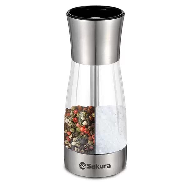 Тип изделия — мельница Назначение — для перца; для соли Тип мельницы — ручная Габариты и вес — высота 19 см Цвет и материал — материал корпуса пластик; нержавеющая сталь